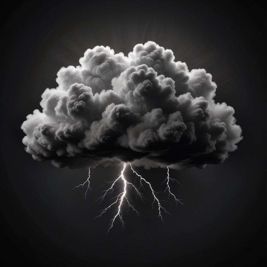 A large, dark storm cloud with several bolts of lightning striking down from it.