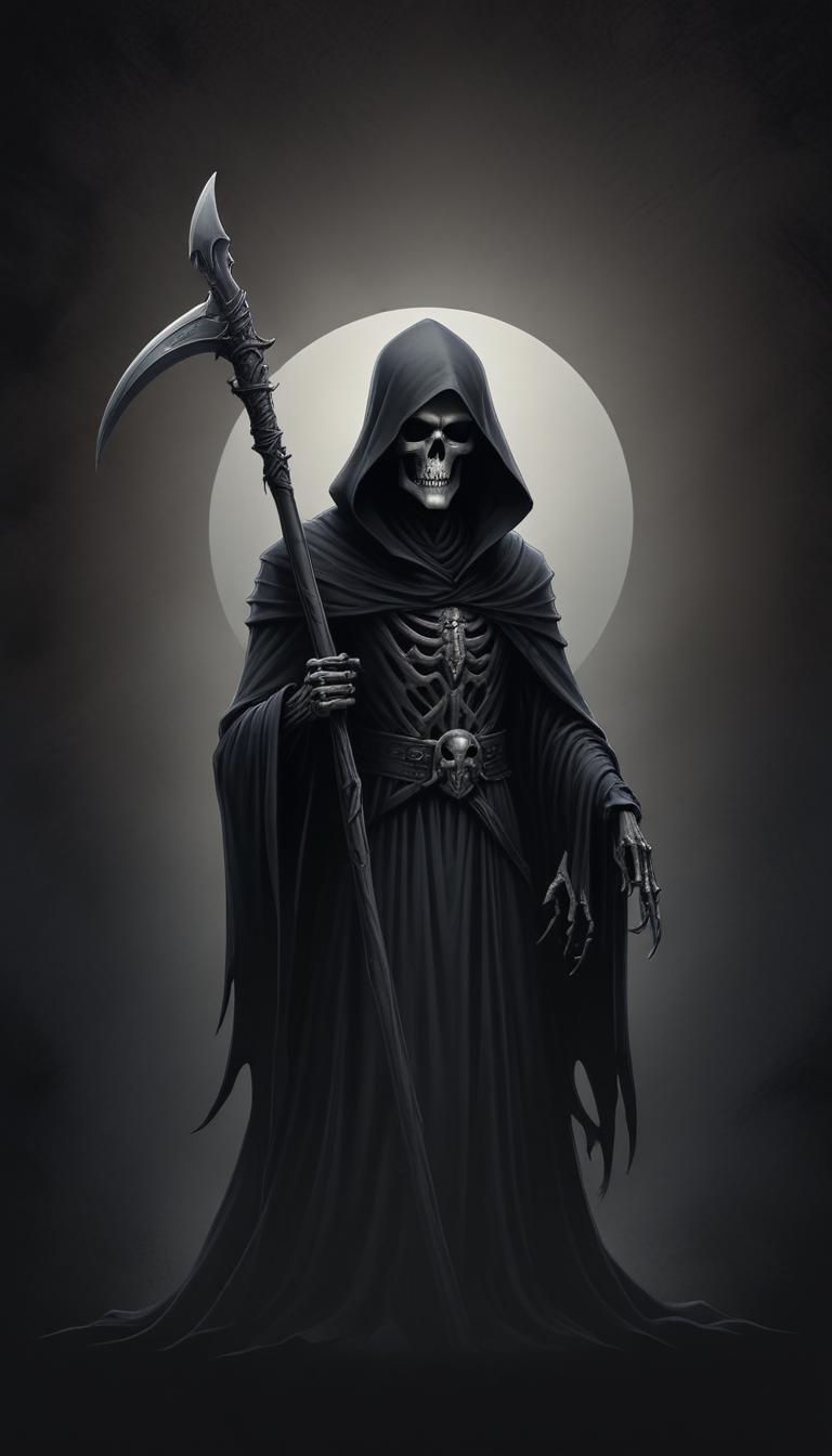 A skeletal figure wearing a black hooded robe holds a scythe and stands against a dark background with a full moon behind it.