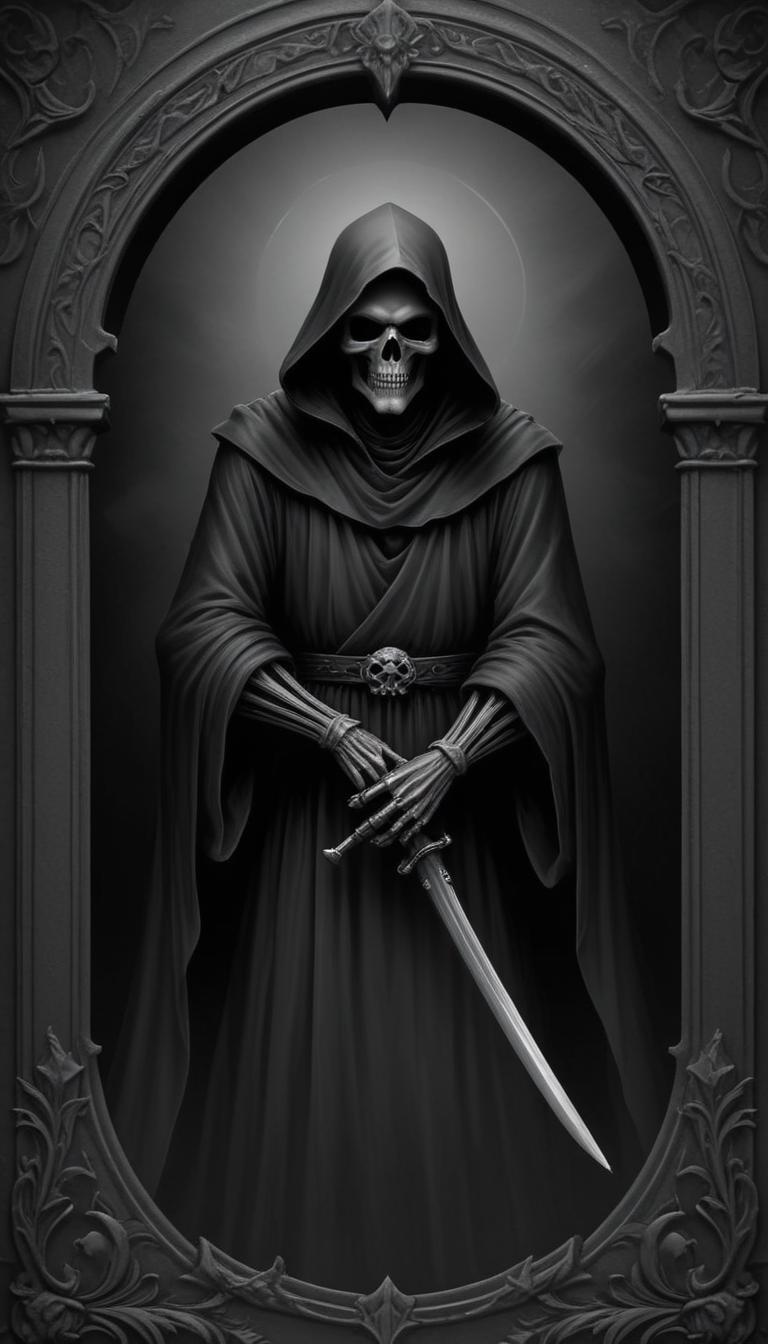 art, bony, carved, dark, death, fantasy, figure, frame, gothic, grim, hands, hooded, horror, ornate, reaper, robe, silver, skeleton, spooky, sword