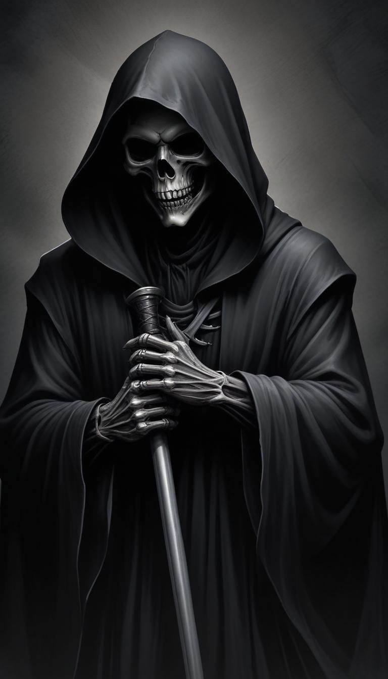 A skeletal figure wearing a black hooded robe stands with their hands clasped around a long staff.