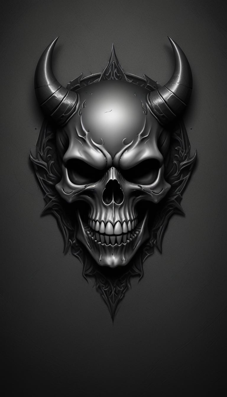 Close-up of a detailed skull with horns on a dark background, featuring a sinister expression, sharp jawline, and sharp teeth