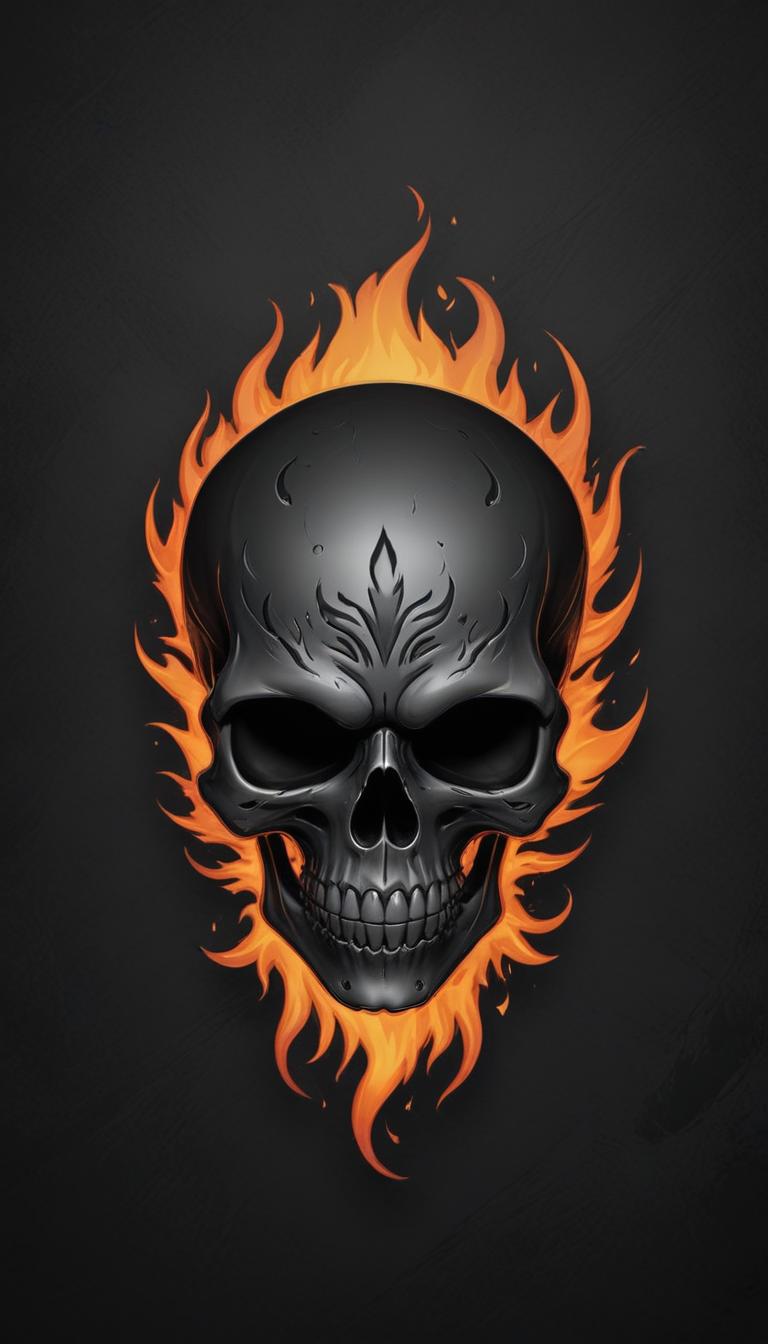 A black skull engulfed in orange flames