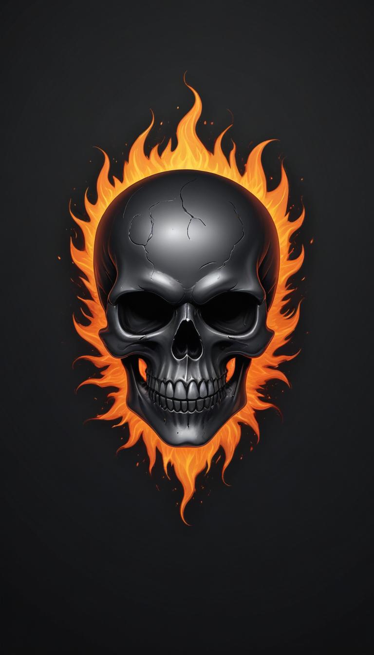 A digital illustration of a black skull with a detailed face surrounded by orange flames on a dark background.