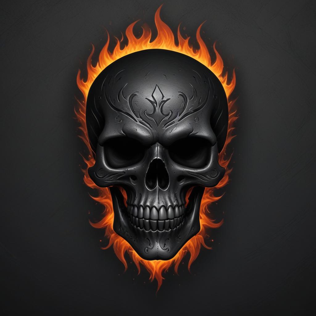 A black skull surrounded by flames