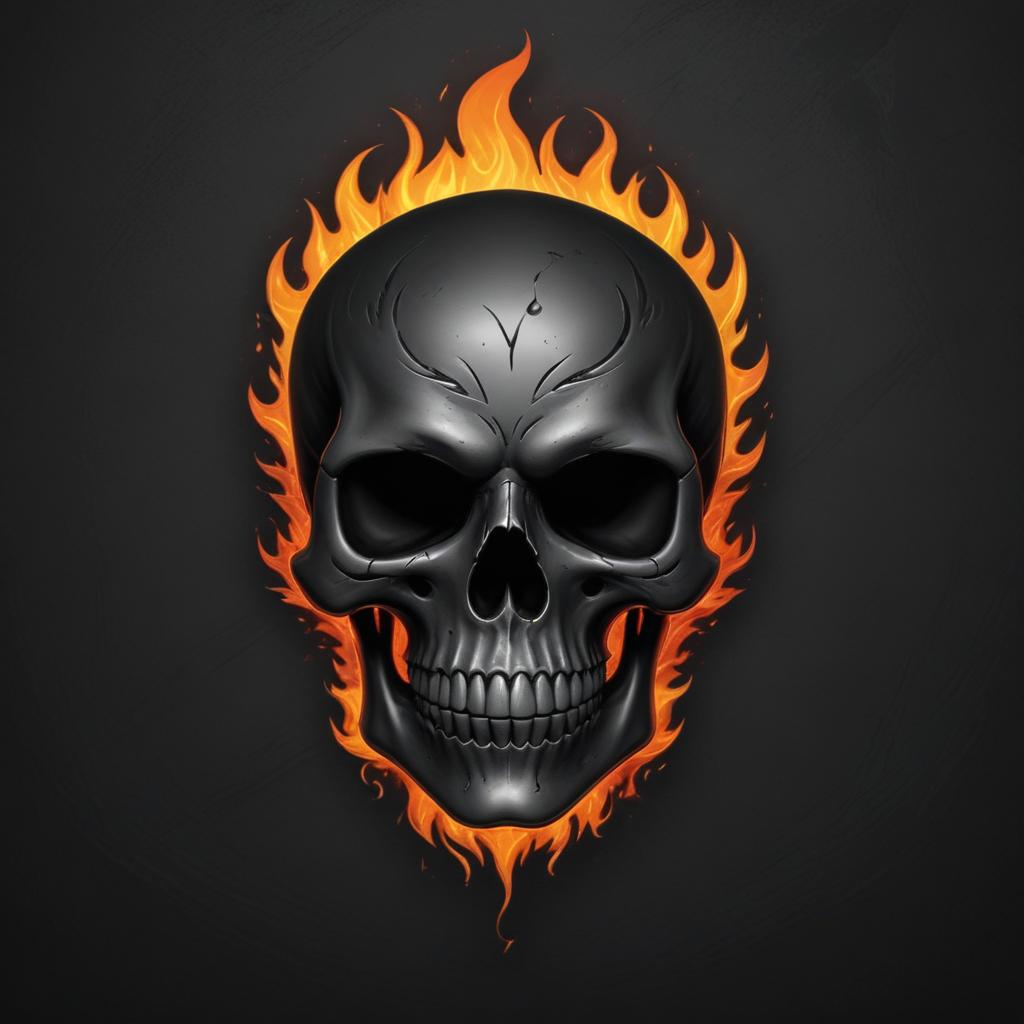 A black skull is depicted in a digital illustration surrounded by a ring of orange flames.