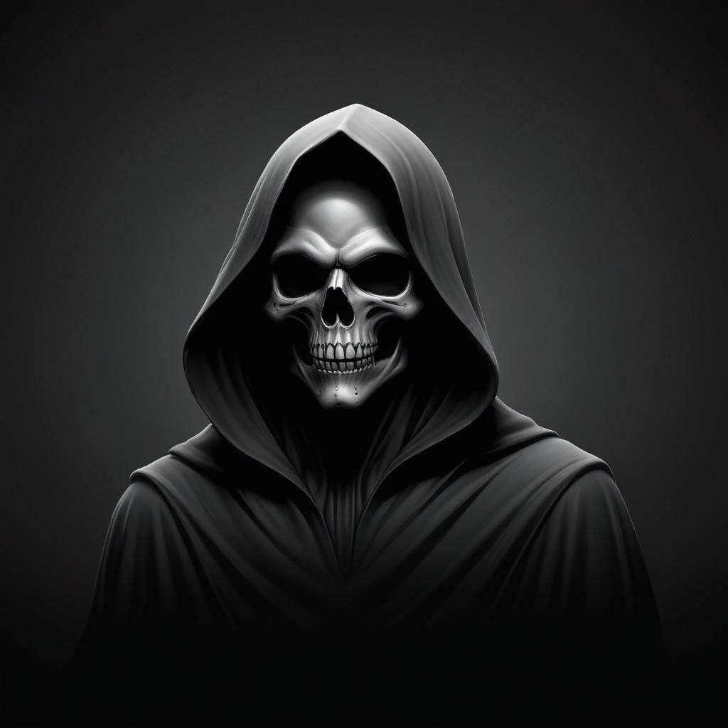 A skull face is visible underneath a dark, hooded cloak. The background is a solid, dark gray color.