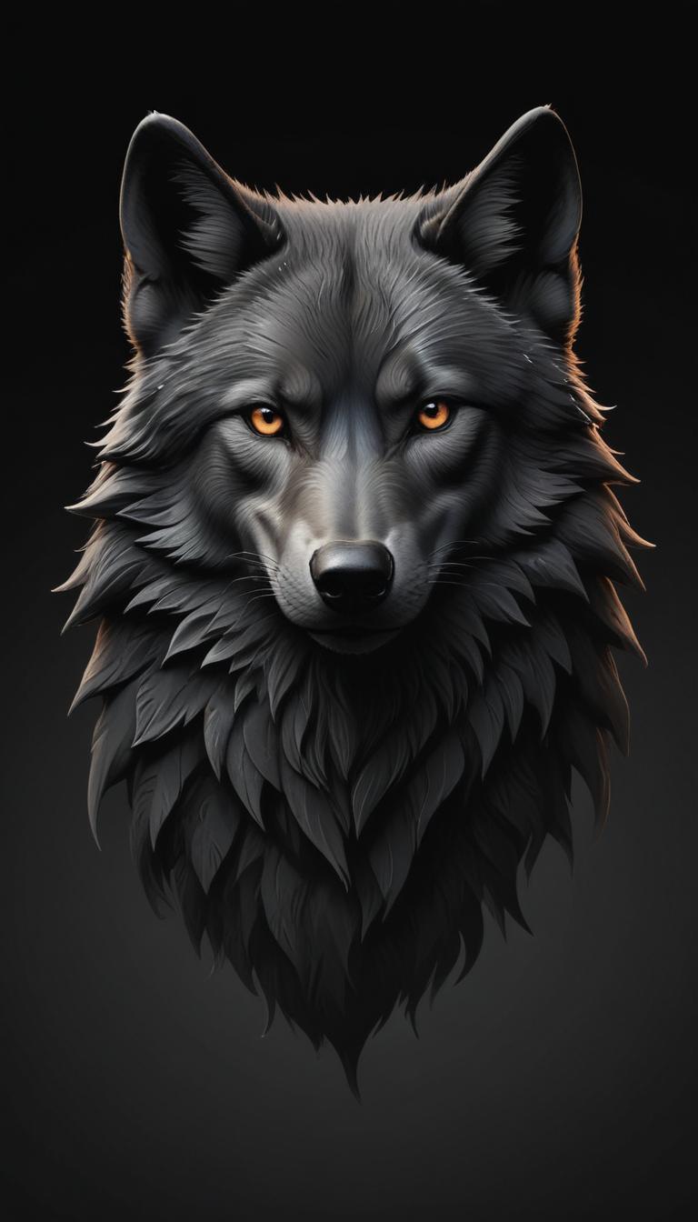 A black wolf's head with amber eyes is centered against a dark background. The wolf's fur is long and fluffy, and its expression is serious.