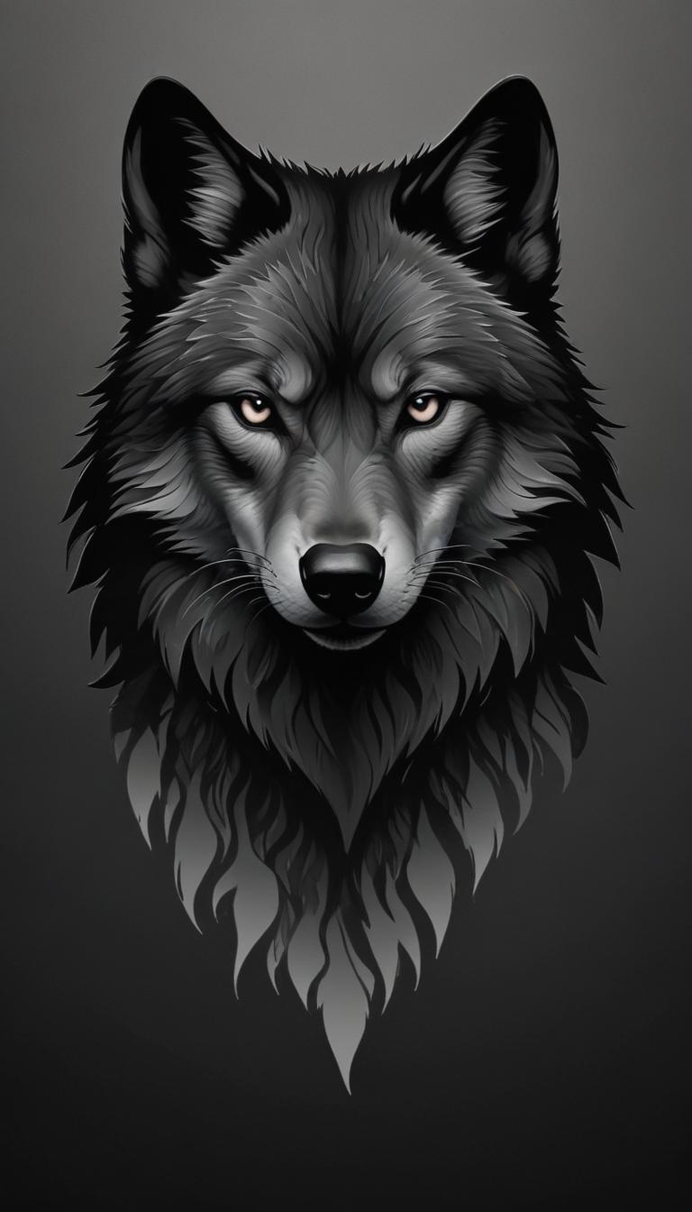 A detailed black-and-white portrait of a wolf's head, with piercing eyes and a fiery mane, set against a dark gray background