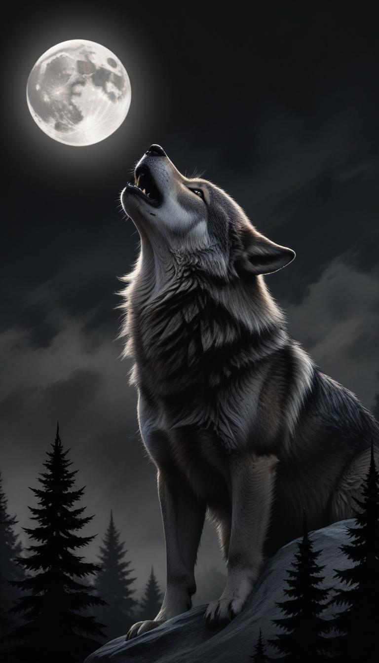 A wolf sits on a rock, howling at a full moon in the sky, with a forest behind it.