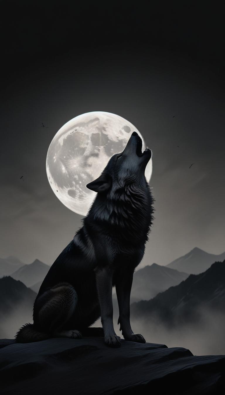 A lone wolf howls on a rocky cliff, silhouetted against a full moon in a starry sky with fog-covered mountains nearby