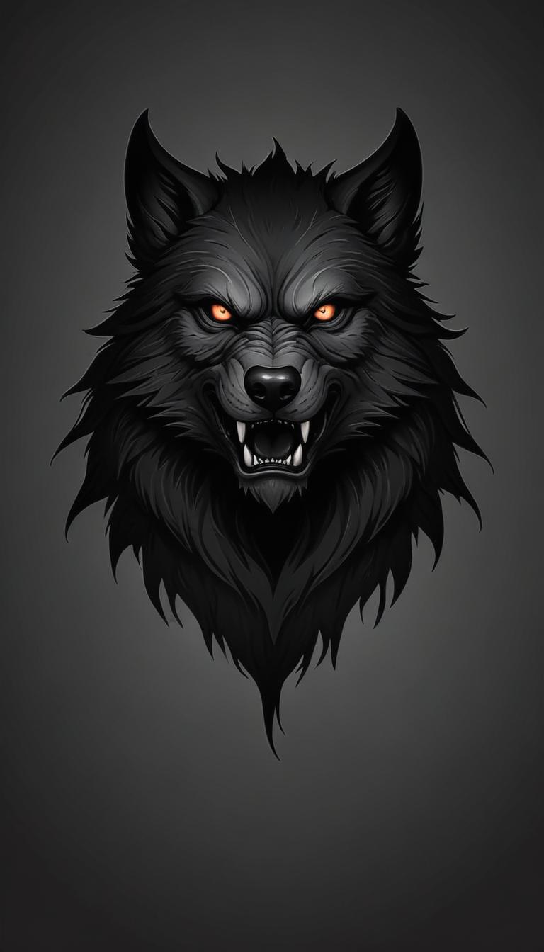 A digital illustration of a black wolf with white eyes snarling with its mouth open, depicted on a dark gray background.