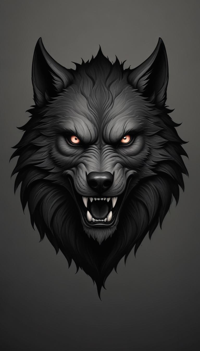 A snarling black wolf's head with sharp teeth and piercing eyes, set against a gray background