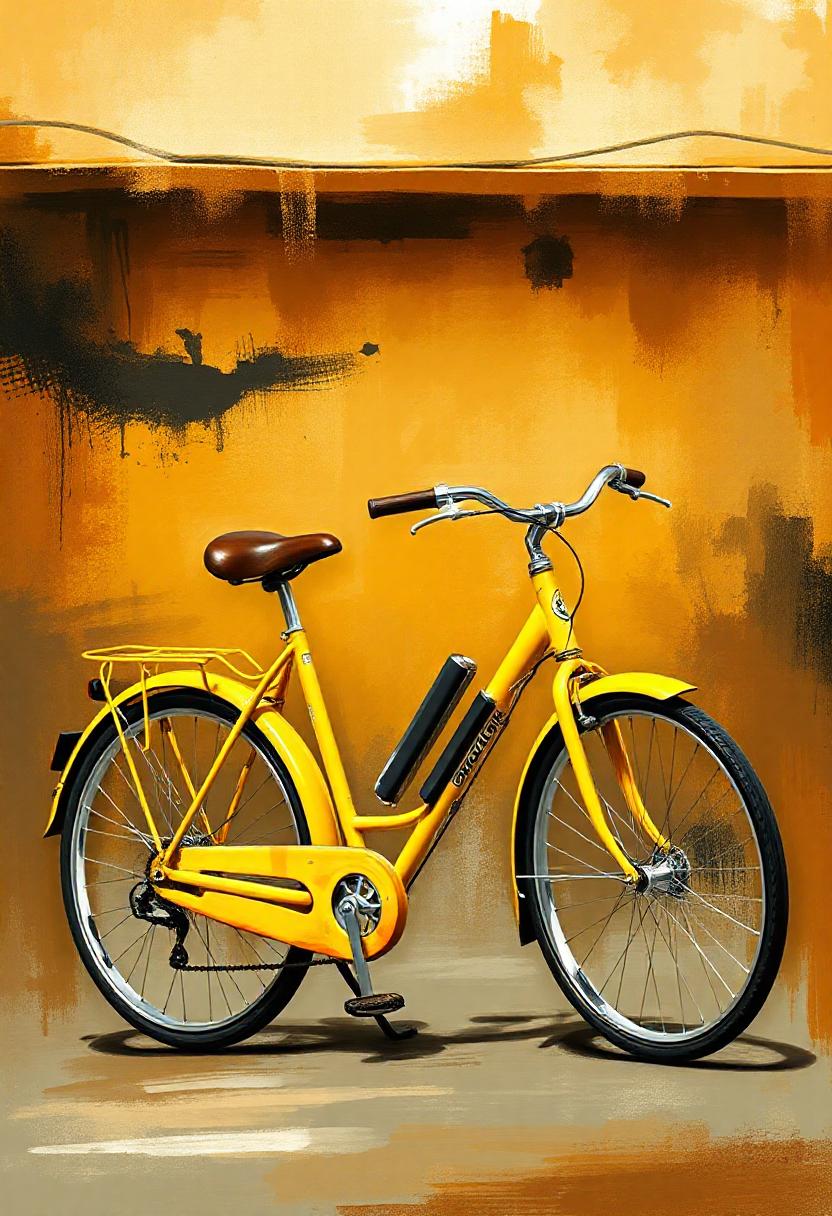 bicycle, black, brown, city, classic, cycling, outdoors, paint, retro, ride, seat, splatter, street, tires, transportation, urban, vintage, wall, wheels, yellow