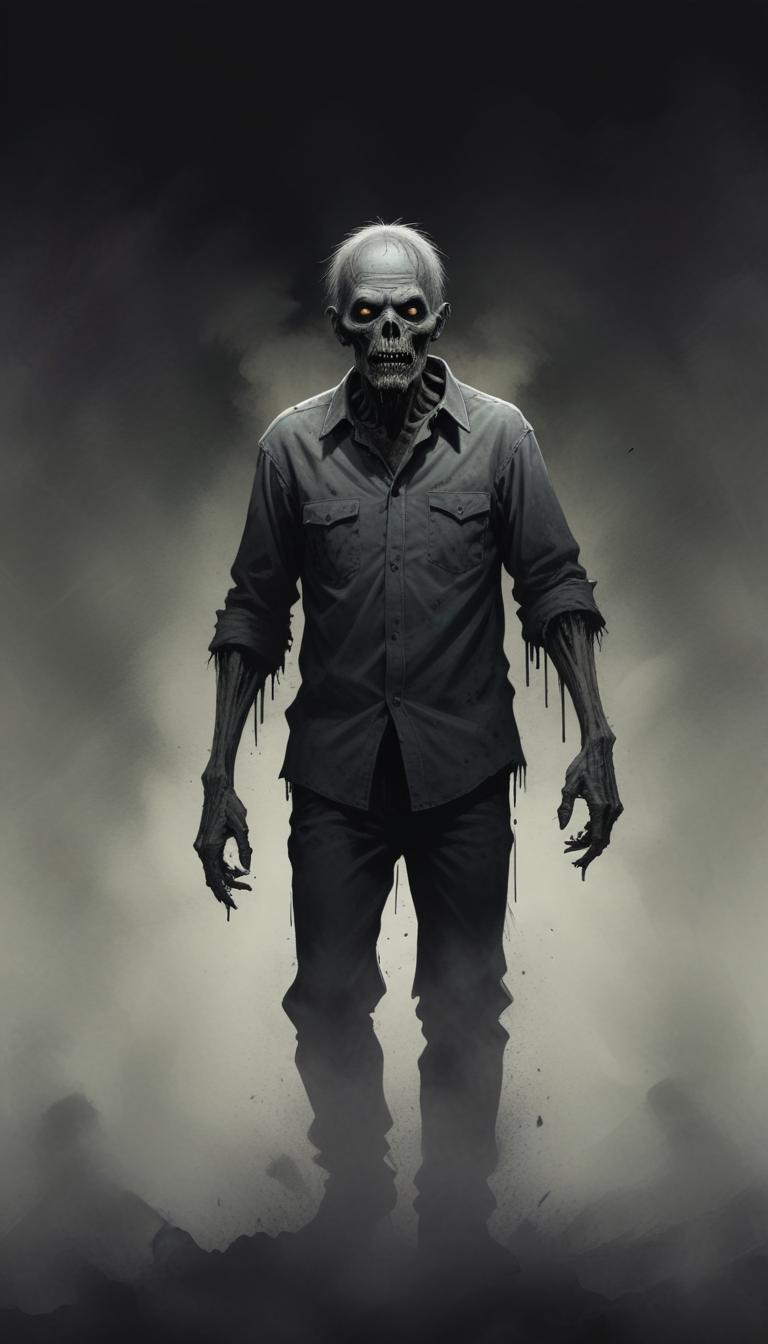 A foggy scene reveals a zombie with a skull, dressed in a black shirt and jeans, arms outstretched and clawed hands ready