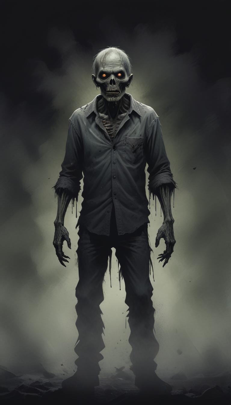 A zombie with decaying flesh and glowing eyes stands in a foggy, dark setting.