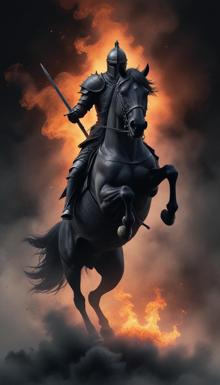 A knight on a black horse rides through flames