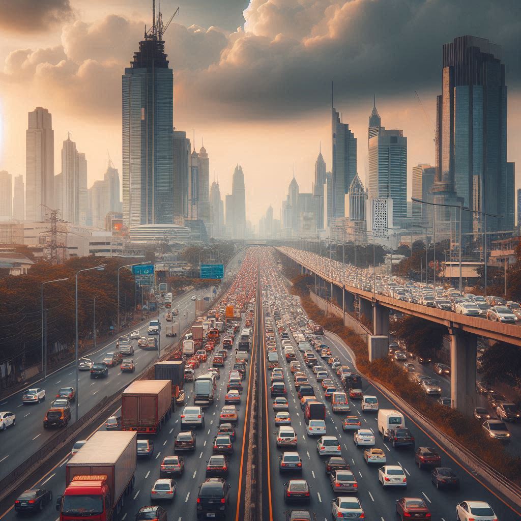 A long traffic jam in a big city at sunset