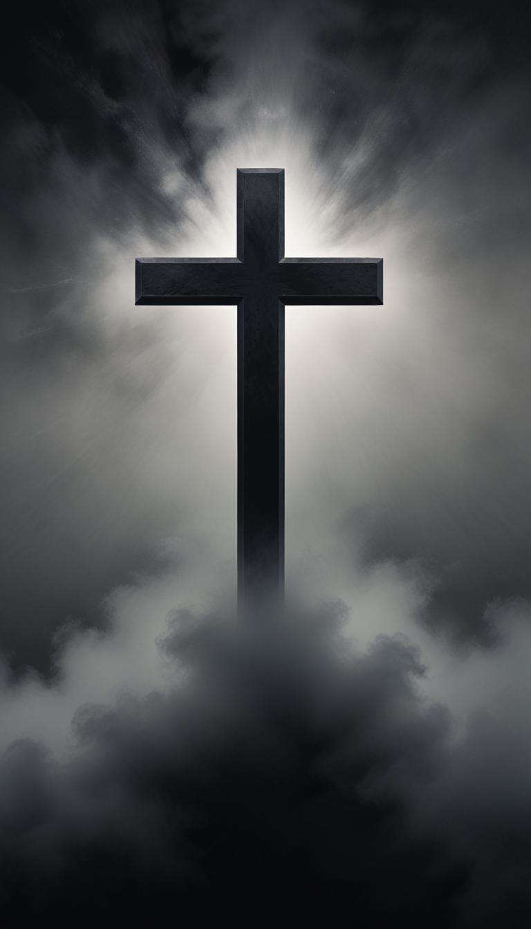 A black cross stands tall in the clouds