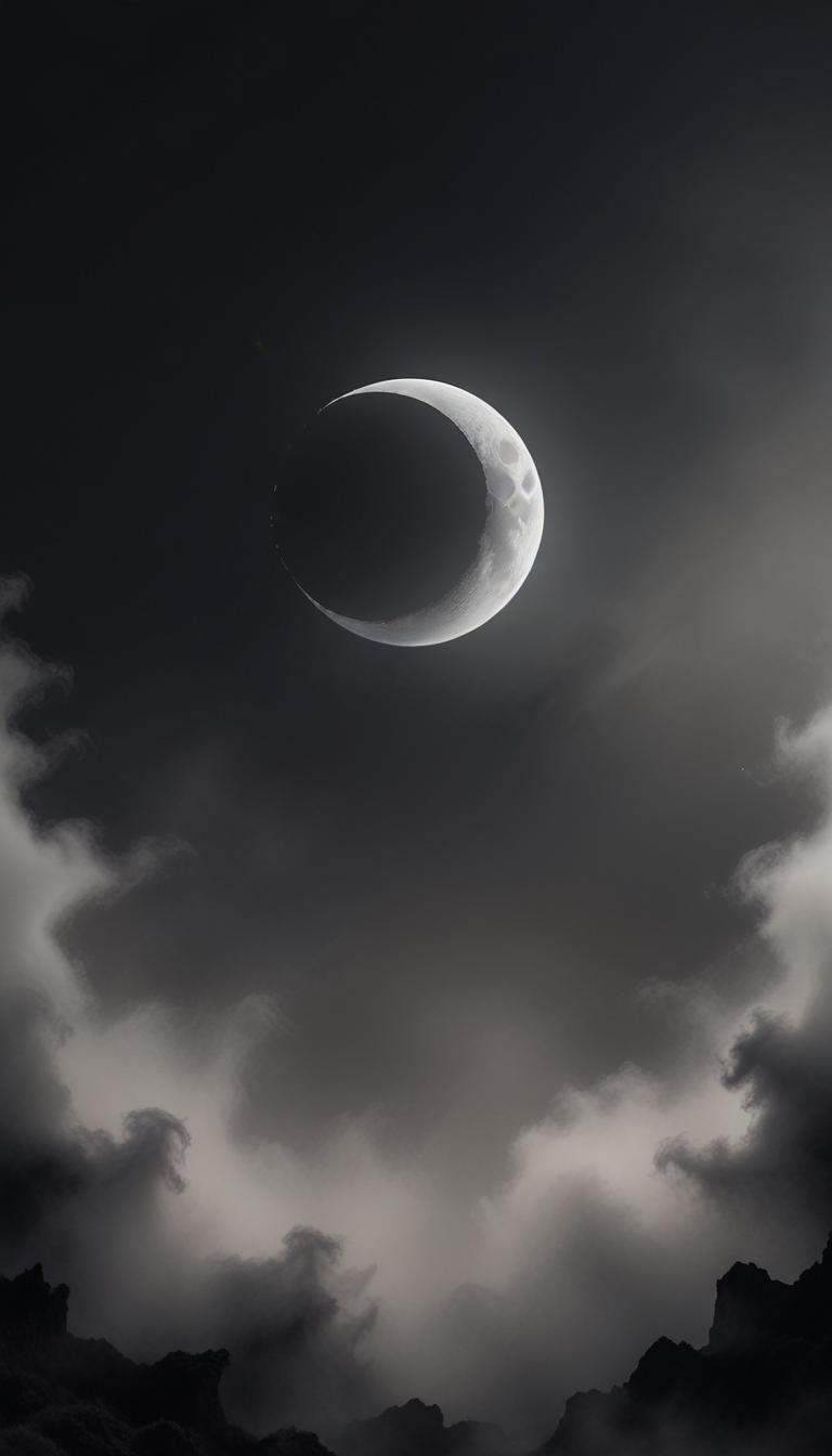 A crescent moon glows softly above a dark landscape, partly veiled by clouds, creating a dramatic and mysterious night scene