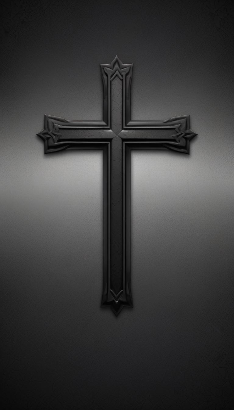 A black, ornate cross is centered against a gray, textured background.