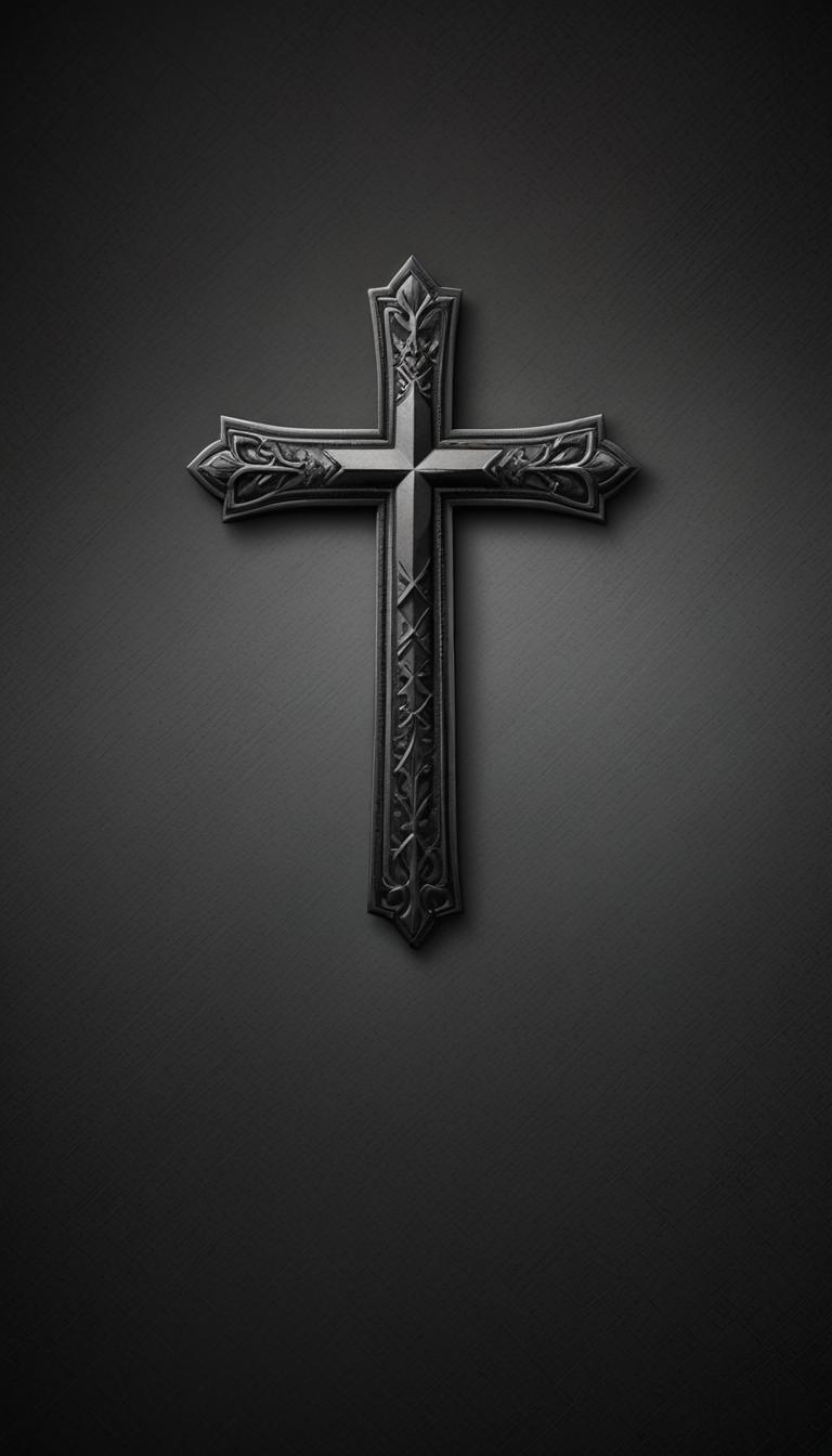 An ornate black cross with intricate details hangs on a dark, textured background.