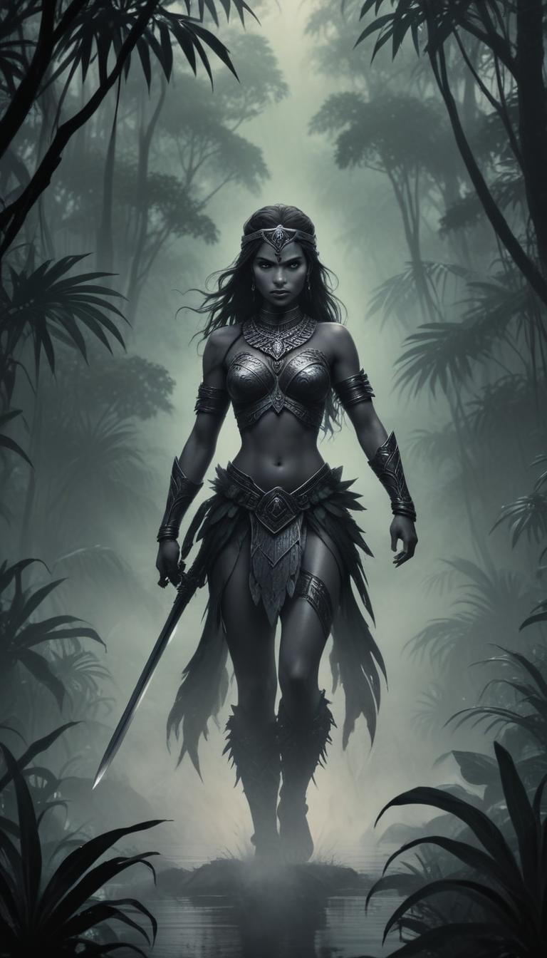 A warrior woman walks through a misty jungle