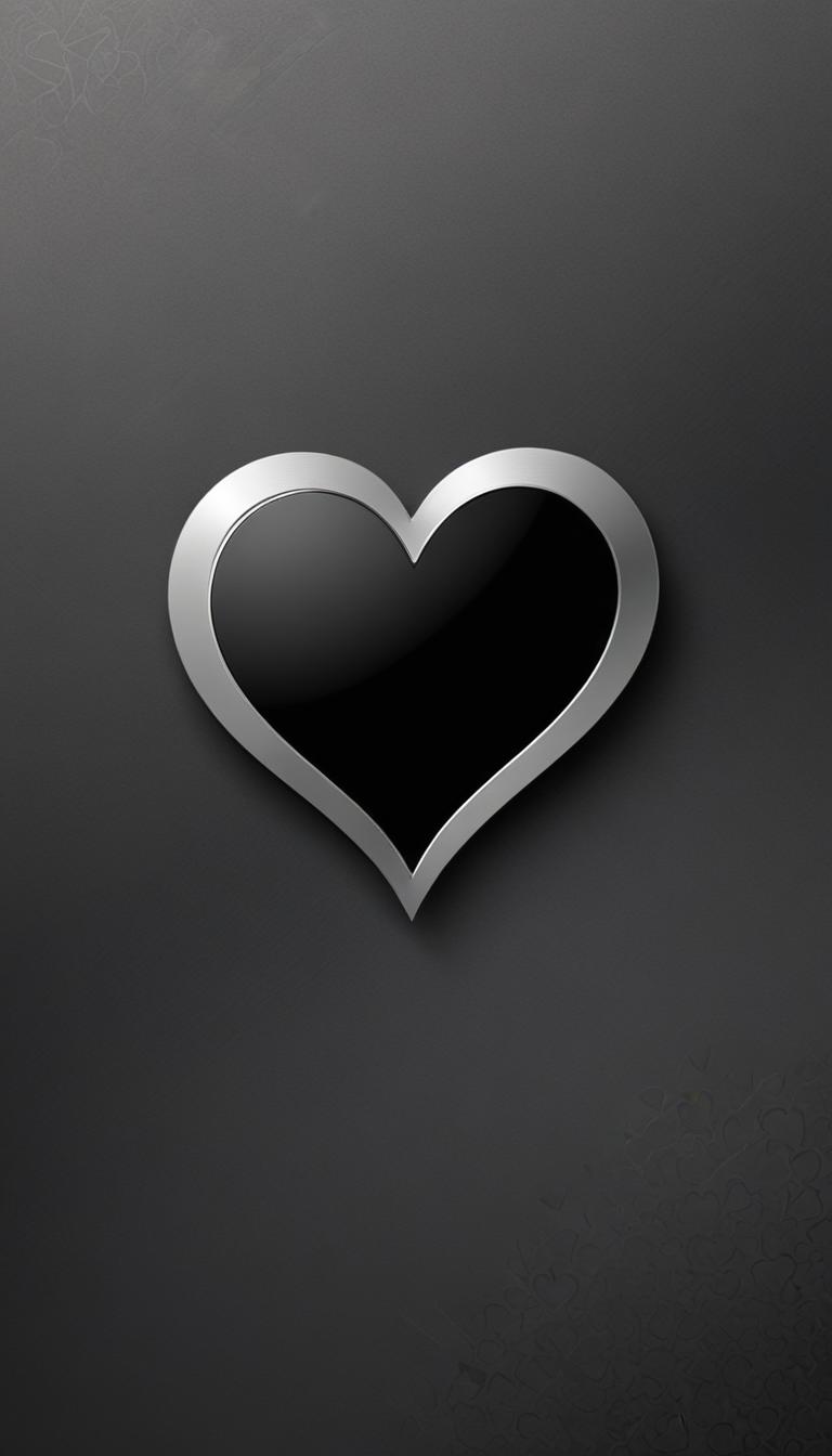A single, black heart with a silver border sits in the center of a gray background. The heart is three-dimensional.