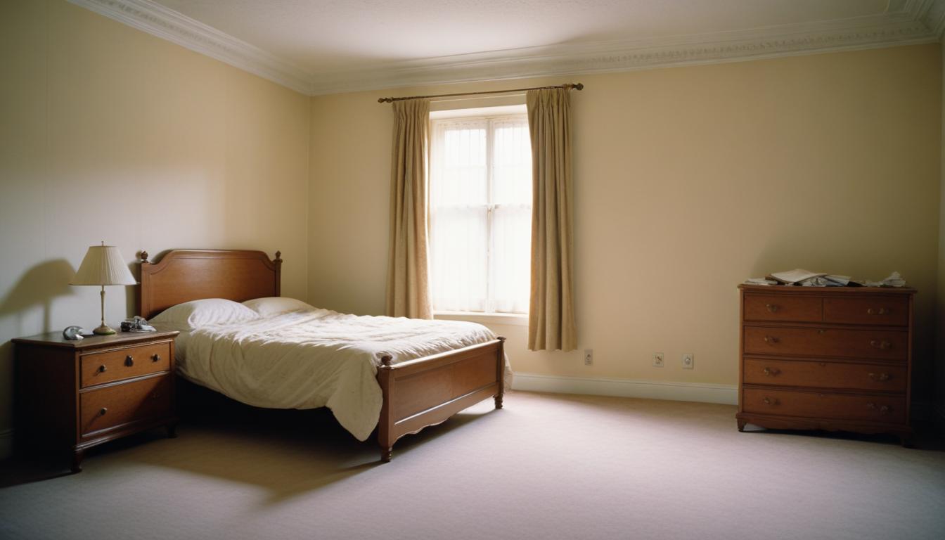 bed, bedroom, beige, carpet, curtain, dresser, floor, furniture, home, house, interior, lamp, light, nightstand, room, sun, sunlight, wall, window, yellow
