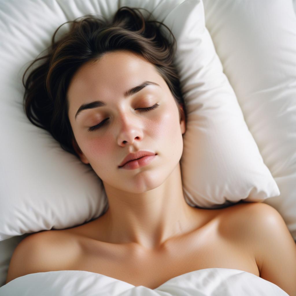 A woman with dark hair is asleep on a white pillow, her eyes closed. She is covered by a white blanket.