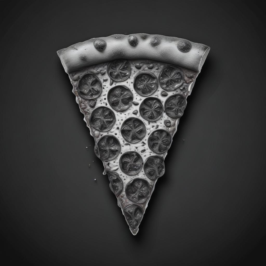 A single slice of pizza sits in the center of a black surface. The pizza has a crust with a raised edge, and it's topped with several round toppings.