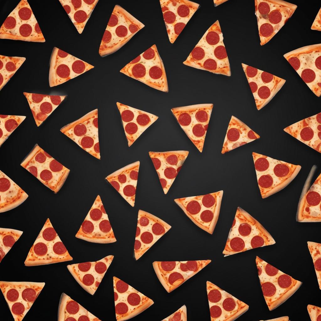 A black background is covered in pepperoni pizza slices, with each slice oriented in a different direction.