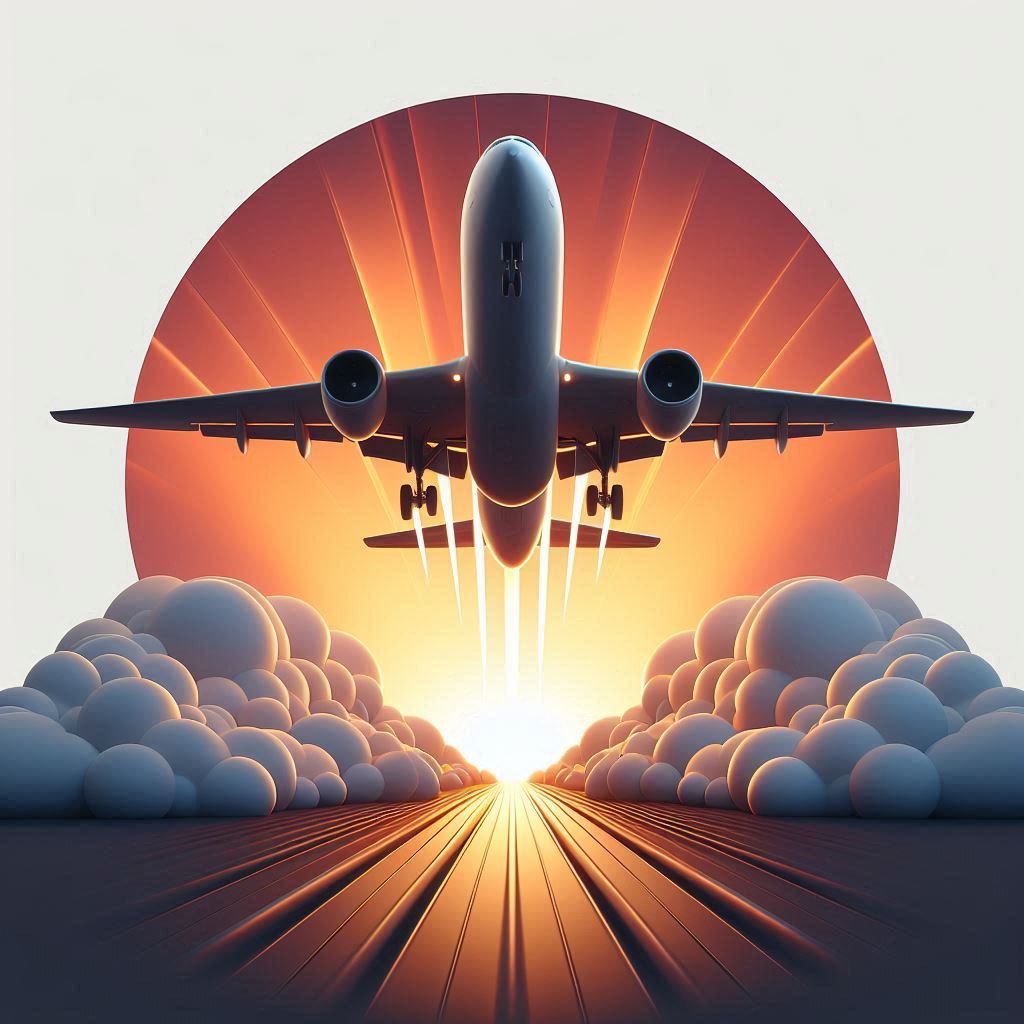 A plane lifts off from a runway toward a large orange sun, surrounded by fluffy clouds.
