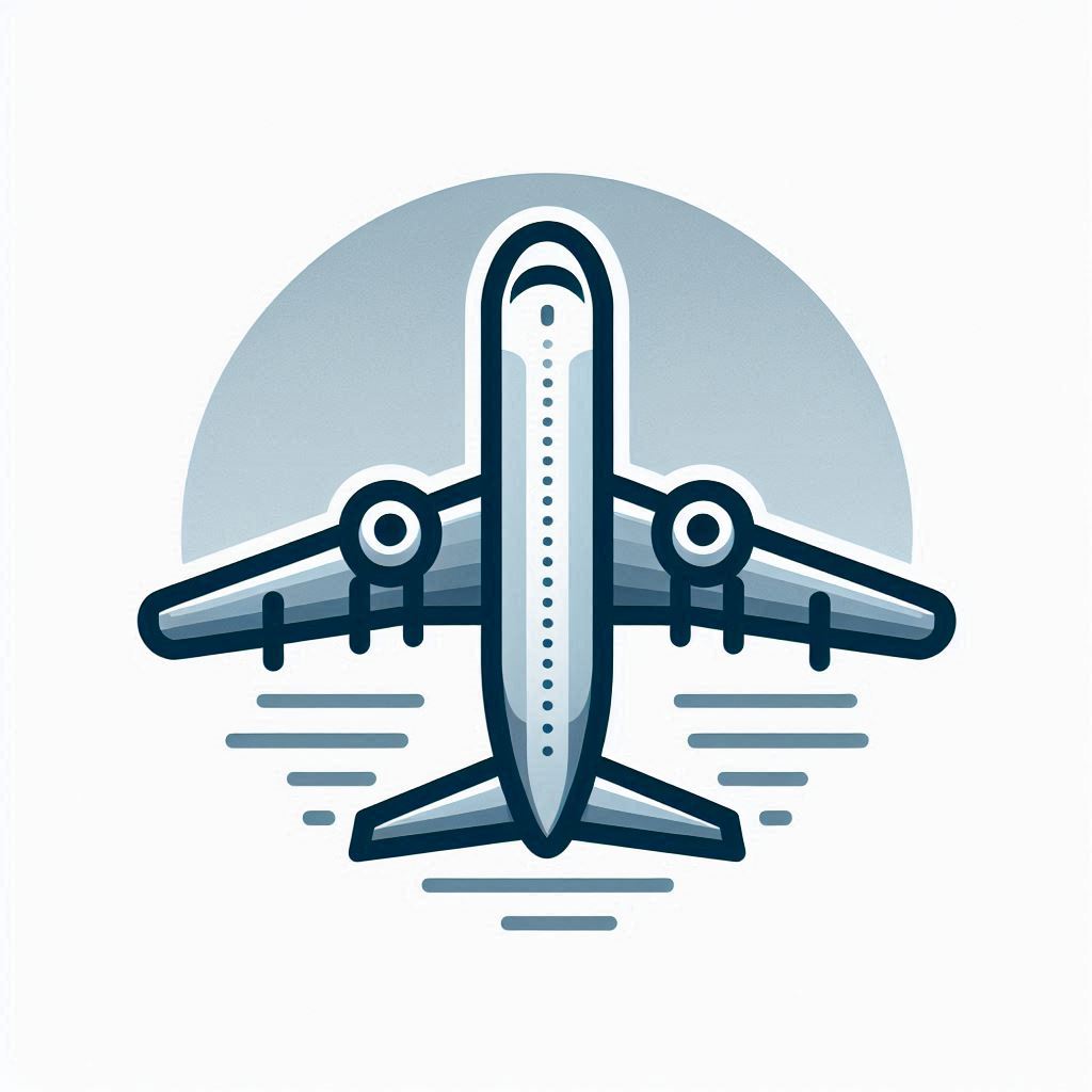 An illustration of a blue airplane flying against a gray sky, depicted by a circle.