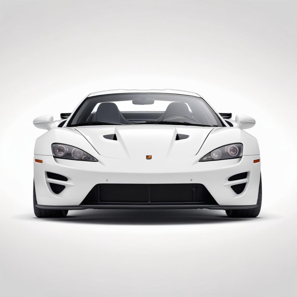 A white sports car is photographed head-on in a studio setting, with a plain white background.
