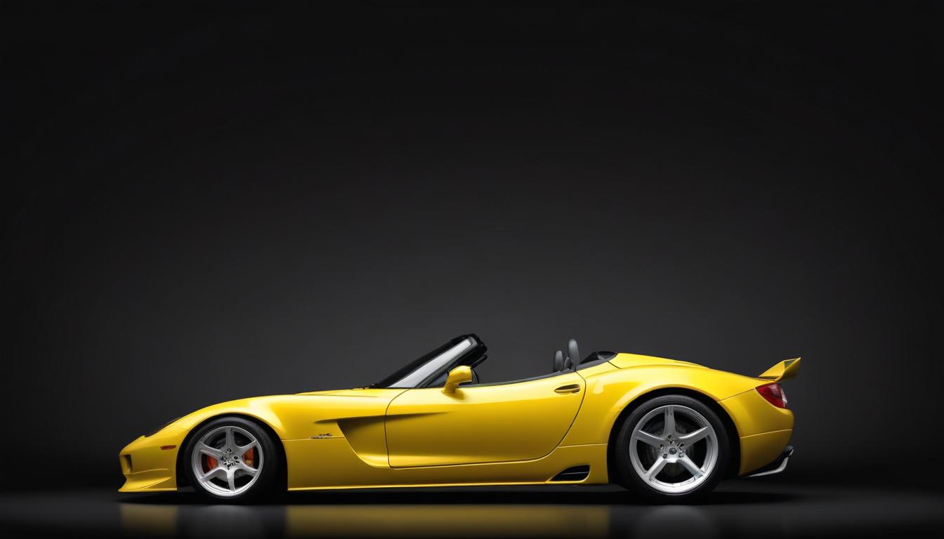 A yellow convertible sports car is parked in front of a black background. The car has a sleek design and large wheels.