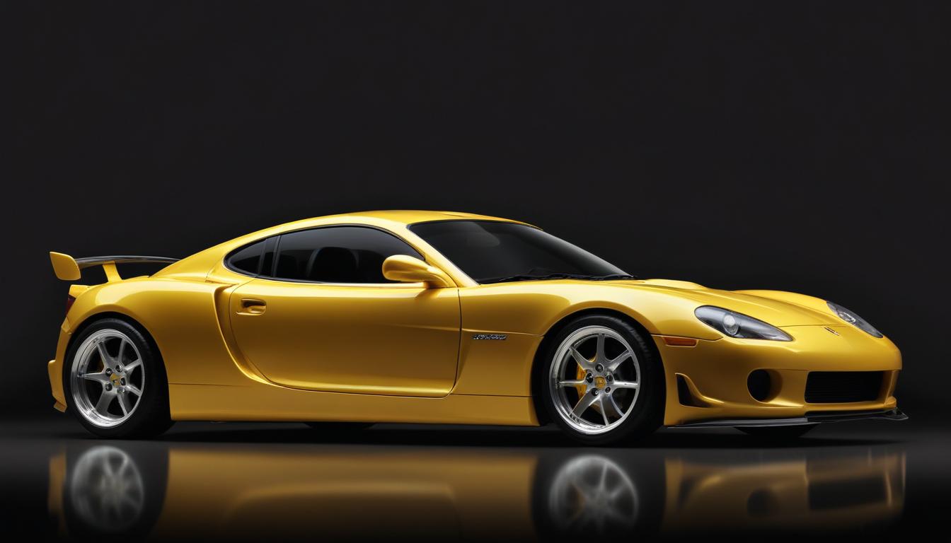 A yellow sports car sits on a black background