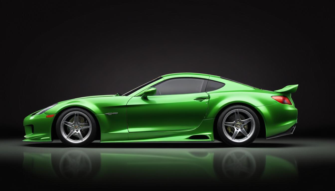 A green sports car is parked on a black surface