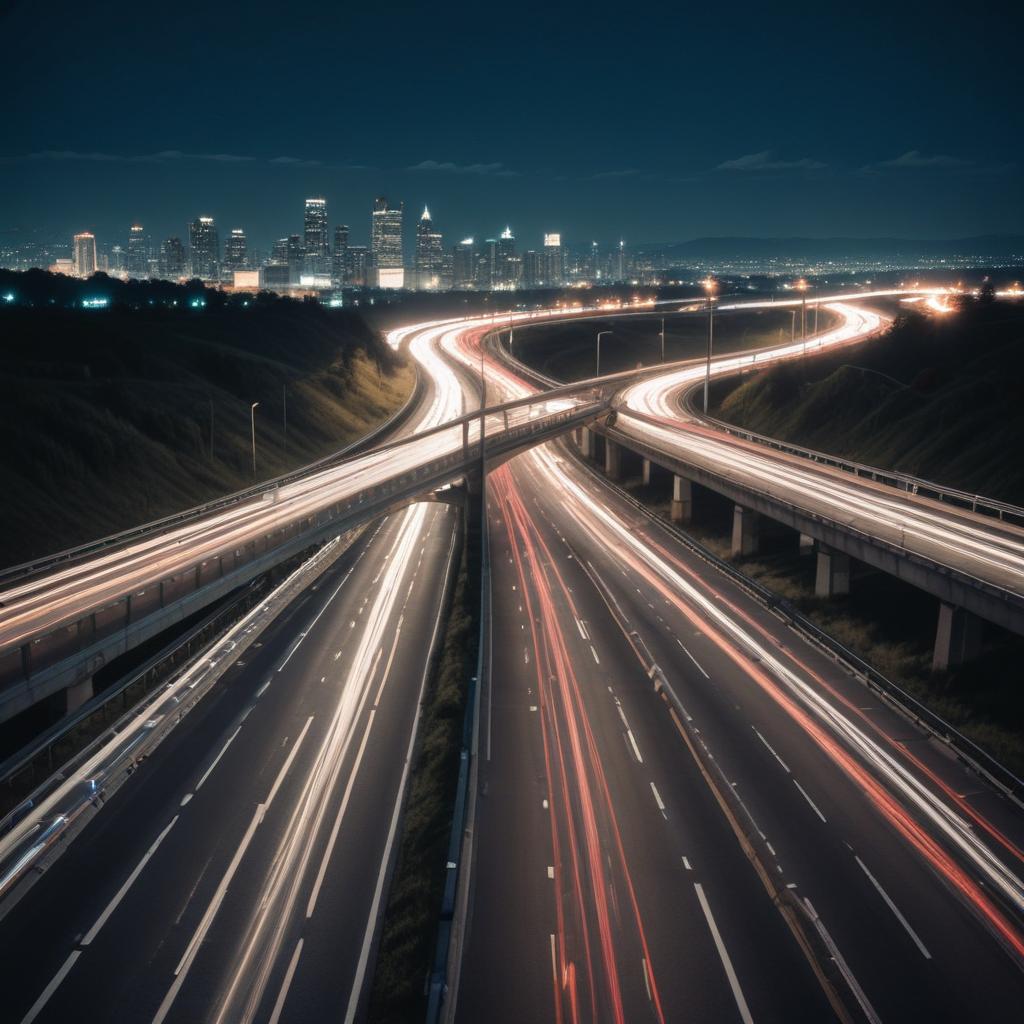 bridge, city, cityscape, driving, exposure, freeway, highway, interstate, lights, long, movement, night, overpass, road, skyline, speed, traffic, transportation, travel, urban