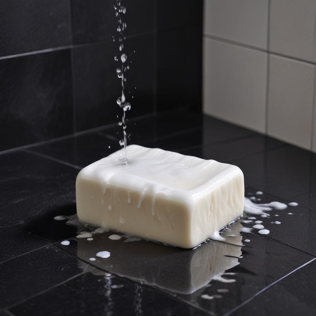A bar of soap sits on a wet, black tiled surface. Water drips on the soap from above.