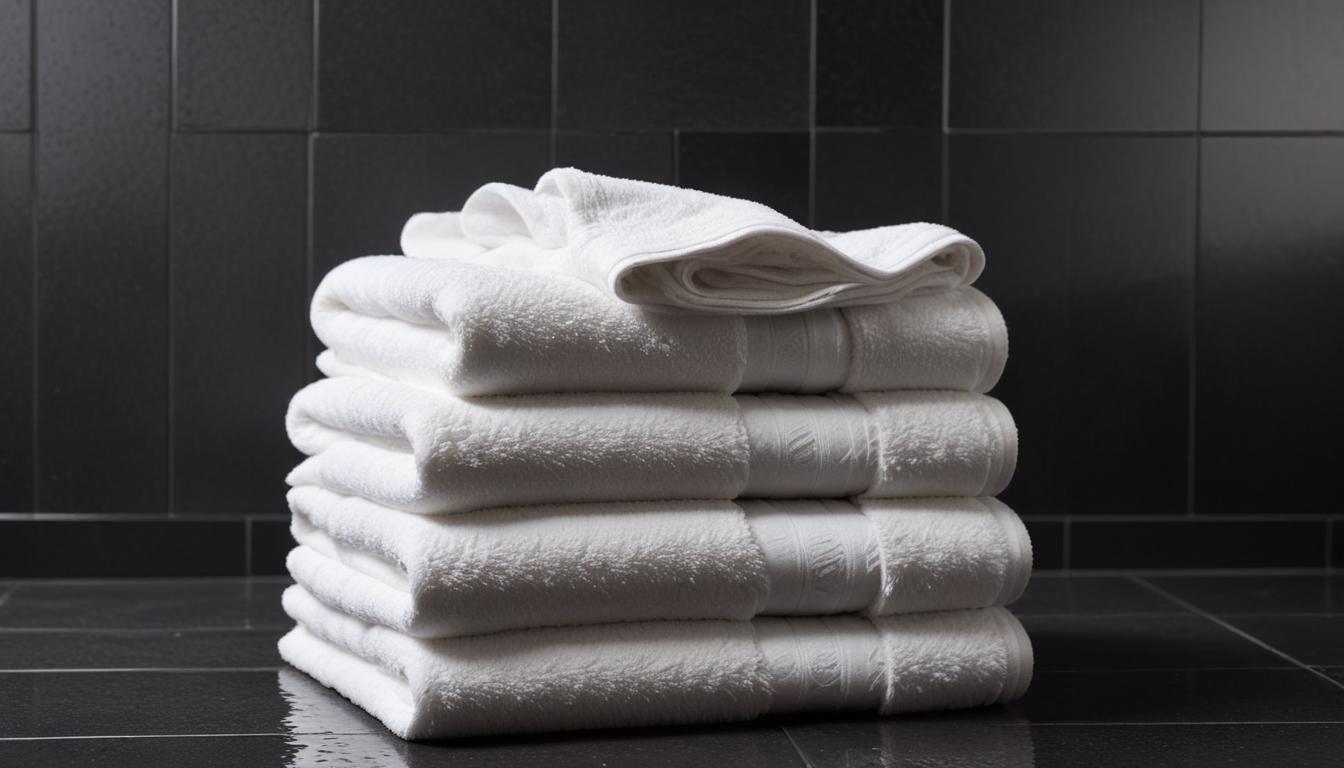 A stack of white towels sits on a black tile floor.
