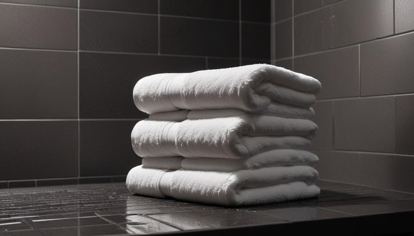A stack of four white towels sits neatly on a black tiled floor, in the corner of a shower stall with black tiled walls.
