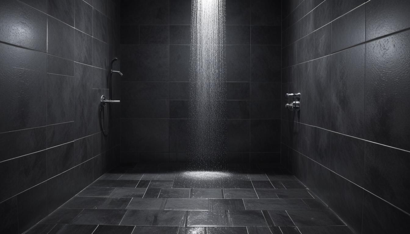 A roomy shower stall with black tile walls features a central showerhead releasing water in a steady stream