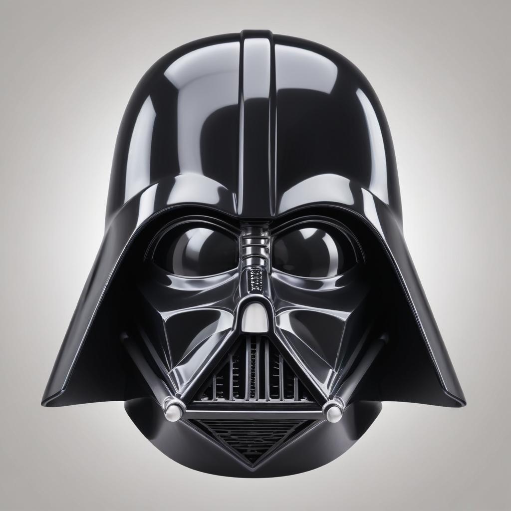 Darth Vader's helmet is shown in front of a gray background. The helmet is black and glossy with a triangular opening for the mouth.
