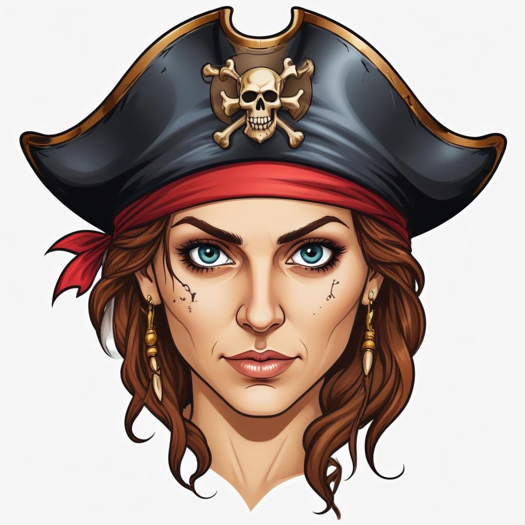 artwork, black, brown, crossbones, earrings, expression, eye, face, facial, female, hair, hat, illustration, intense, look, pirate, serious, skull, stare, woman