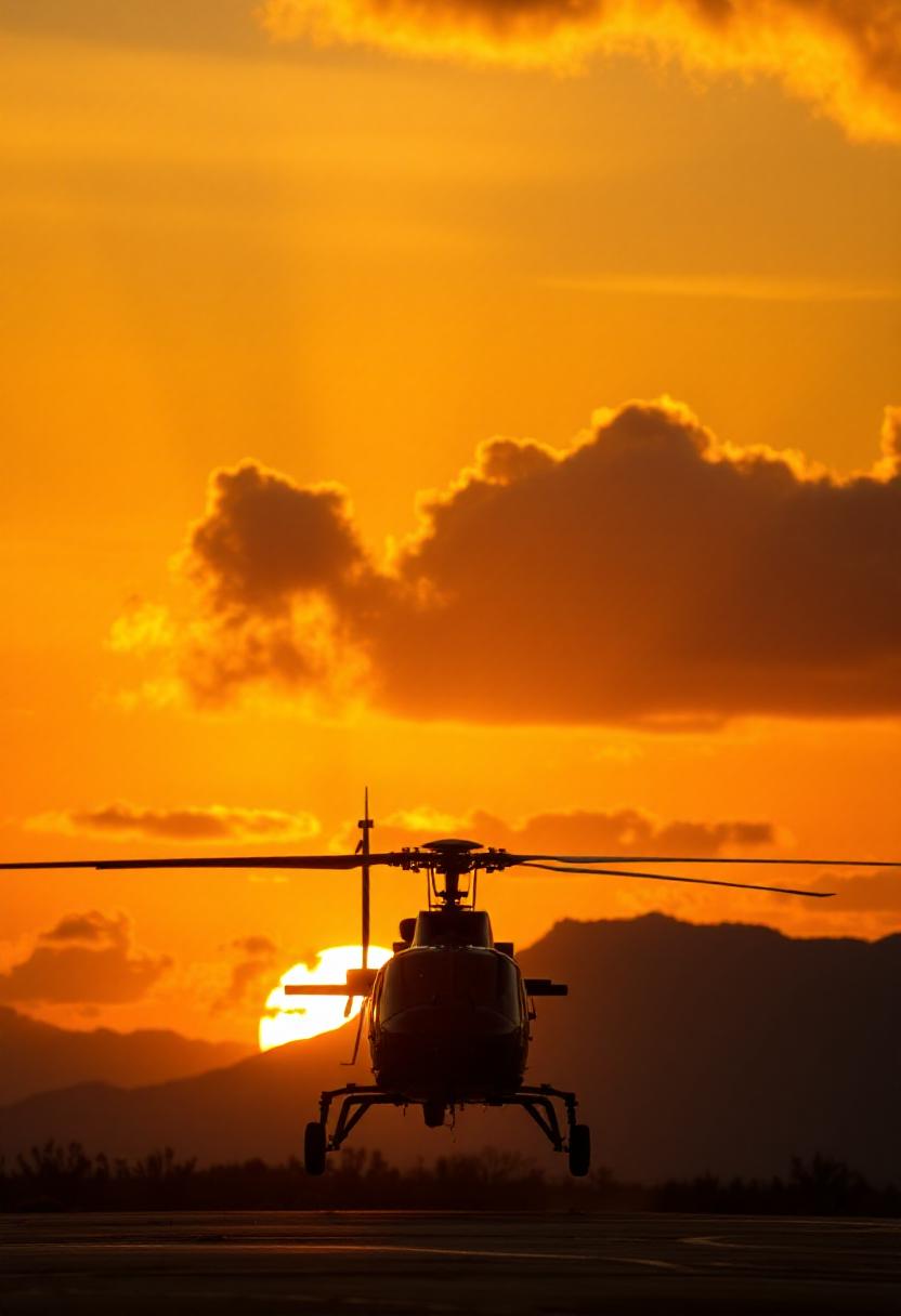 A helicopter, silhouetted against a bright orange sunset, sits on a tarmac runway with mountains in the background.
