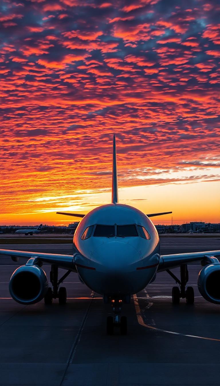 airline, airplane, airport, arrival, aviation, clouds, departure, dusk, evening, flight, orange, passenger, red, runway, sky, sunset, terminal, transportation, travel, twilight