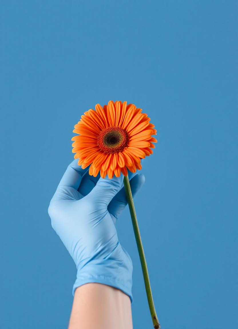 A gloved hand holds an orange gerbera daisy against a bright blue background, with the flower facing the camera