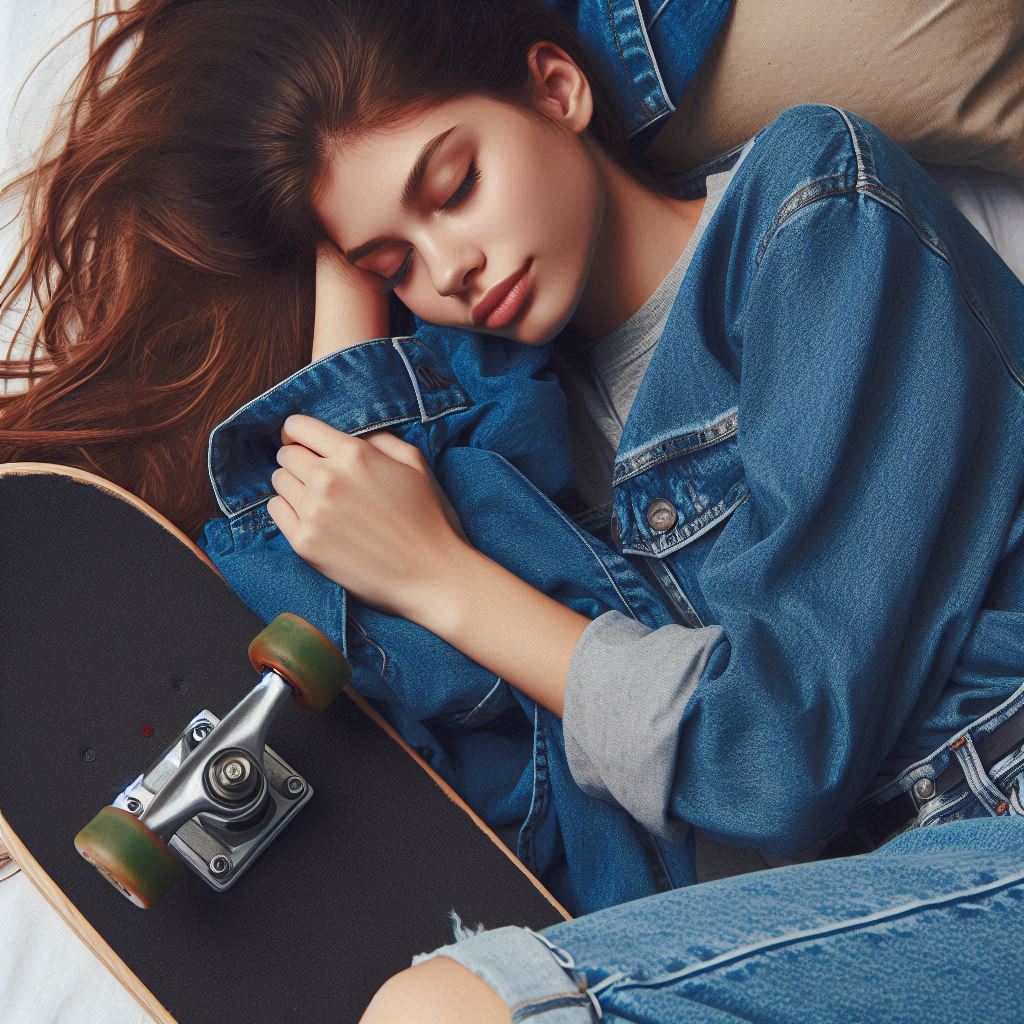 bed, brown, casual, comfortable, denim, fashion, hair, jacket, jeans, long, nap, peaceful, relax, rest, skateboard, sleeping, street, style, tired, woman