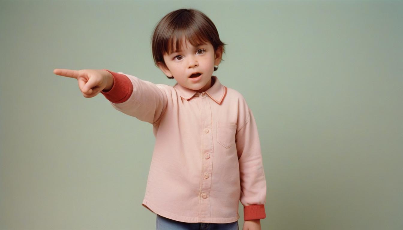 A young boy with short brown hair in a light pink shirt points left, looking surprised against a solid green background