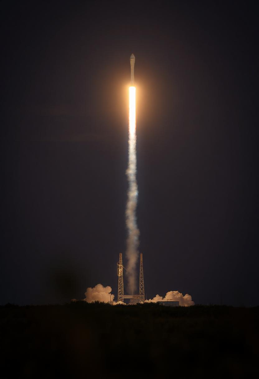 A rocket launches into the night sky